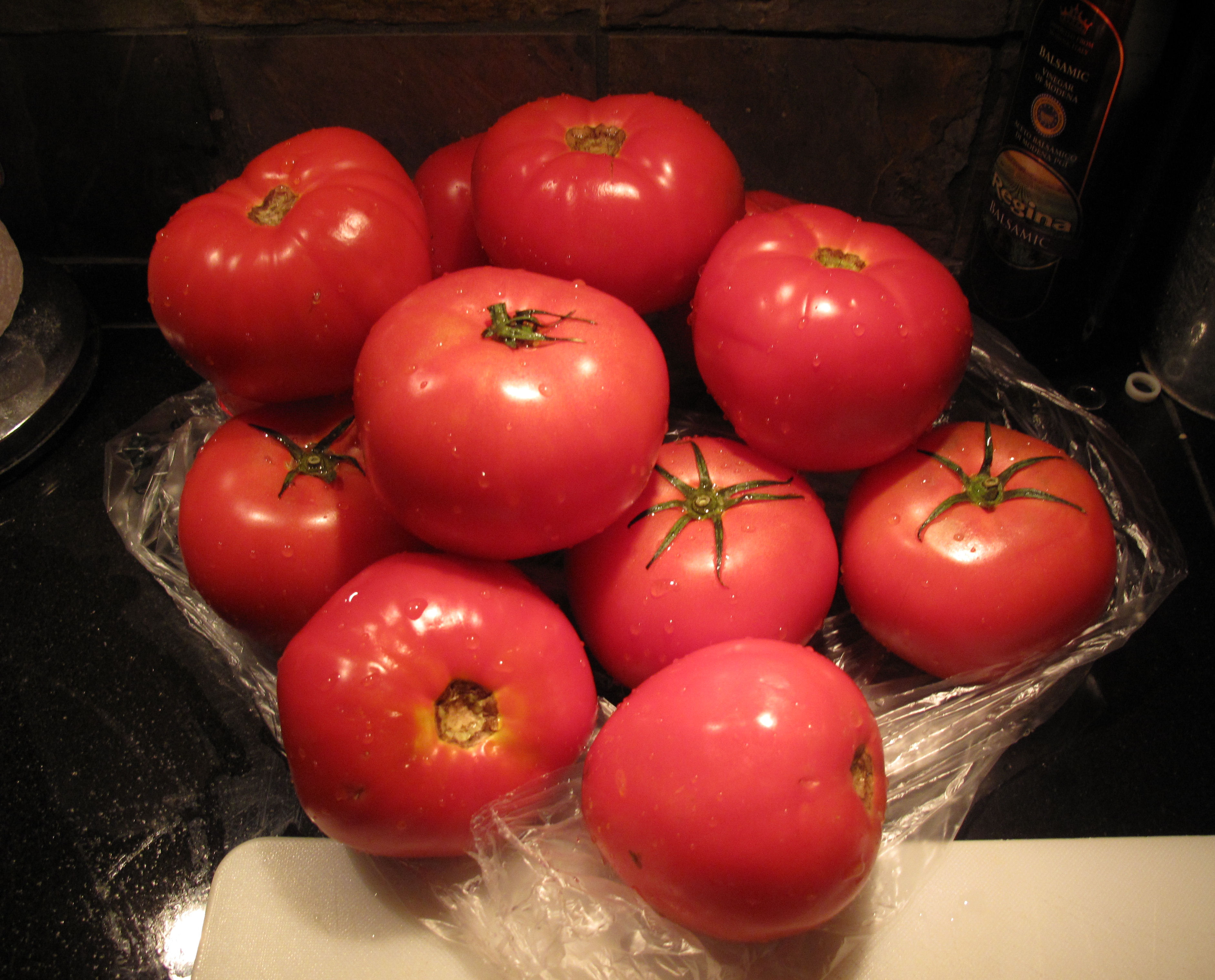 Tomatoes anyone? 4 plants and well, they grew fast when the heat finally came to my neck of the woods but then came the RAIN!!! Took forever for the fruit to grow and ripen properly…and then, after that one harvest (not many and small) they decided to die off (too much rain again). Then we had a week of nice weather and they are now perking up and setting fruit again, but I am not expecting too much.