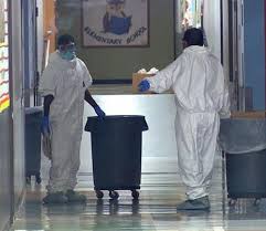SPILLS: Allow aerosols to settle and, wearing protective clothing, gently cover spill with paper towels and apply suitable disinfectant, starting at the perimeter and working towards the centre. Allow sufficient contact time before clean up (39).