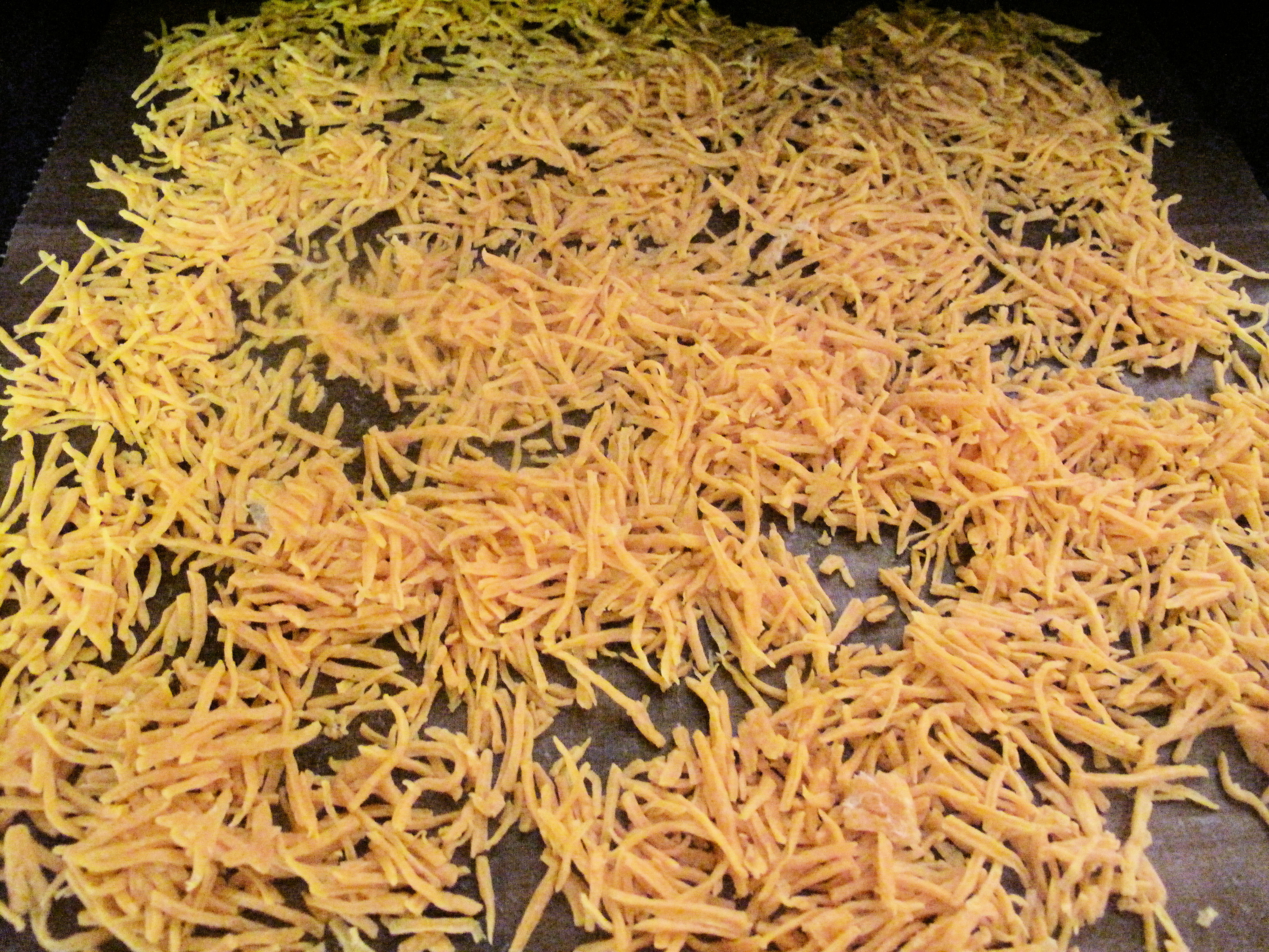 There is a catch however. If you use regular cheese you will have to deal with the ‘fat’ that comes out of it. Originally I thought I would get smart and well, put paper towel under it while dehydrating but when I checked it half way through some had ‘melted’ to it. So don’t that at home folks…instead, dehydrate and after doing so place on a towel and pat the oil off and then vacuum seal! Each pouch contains approximately 1 lb of shredded cheddar cheese. Great crunchy snack by the way!